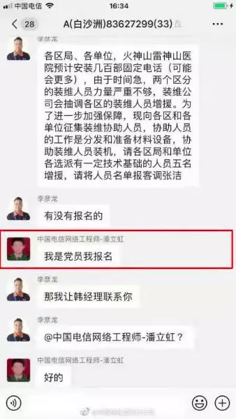 为了保障医院固定电话的正常运维,武汉电信计划从各区抽调人员,增强前线保障力量。通知刚刚发出,武昌区分装维员工潘立虹立即响应。“我是党员我报名!”