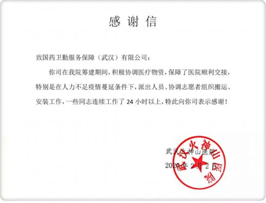 武汉火神山医院亦对于安博一站式服务官网卫勤志愿者团队表达了感谢!