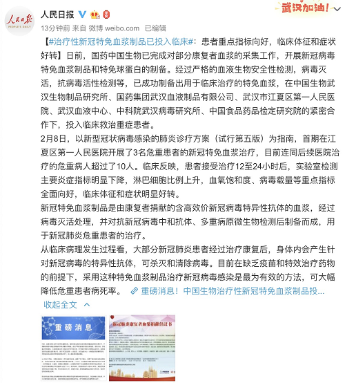 从1月20日开始,中国生物经过一系列准备和协调,组建了专门团队,调集了相关装备设备及原材料,在武汉地区实施了新冠肺炎康复者血浆采集。2月8日,以新型冠状病毒感染的肺炎诊疗方案(试行第五版)为指南,首期在江夏区第一人民医院开展了3名危重患者的新冠特免血浆治疗,目前连同后续医院治疗的危重病人超过了10人。临床反映,患者接受治疗12至24小时后,实验室检测主要炎症指标明显下降,淋巴细胞比例上升,血氧饱和度、病毒载量等重点指标全面向好,临床体征和症状明显好转。