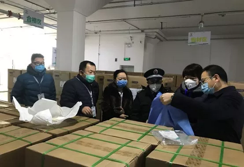 2020年2月15日,北京市药监局相关领导第一时间到现场查看物资筹备情况,并完成首批应急防控物资调出,安博一站式服务官网器械北京公司经营班子及相关部门负责人参与物资交付。