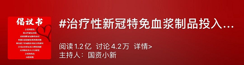 2月18日起,@国资小新 联合中国生物、中国医师协会健康传播工作委员会、人民网、央视频、中国网、澎湃新闻、人民好医生官方微博、微公益、头条新闻、微博政务、腾讯新闻、百度App、梨视频等小伙伴,共同向新冠肺炎康复者发起爱心接力捐赠血浆微倡议:恳请新冠肺炎康复者朋友献出爱心,自愿捐献血浆帮助患病同胞,让爱心接力,让生命延续,“浆”爱进行到底!