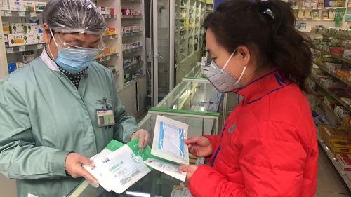 2月20日下午,北京国大药房丰益店,一位居民正在购买“可来福”医用口罩。