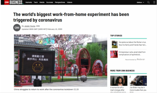 国际主流媒体评论称疫情引发了“世界最大规模居家办公实验”,为应对新型冠状病毒肺炎疫情,中国启动了大规模居家办公、线上教学活动,以减少集体外出。