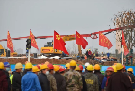 1月28日,中建三局雷神山医院项目指挥部火速成立临时党委,并为党员突击队、青年突击队授旗。郑学选在动员讲话中指出,这是个不平凡的春节,越是艰难,越能体现三局人的担当和精神。