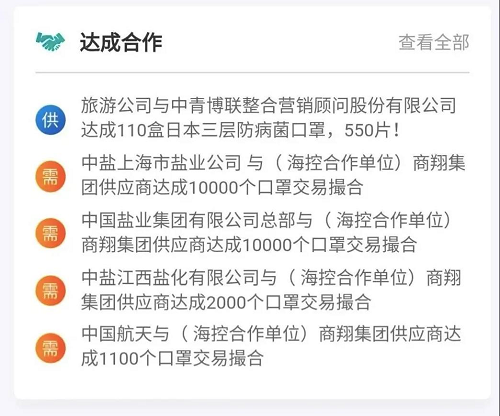 平台充分发挥中央企业上下游生态圈协同优势,调动相关国资国企物资生产技术能力和物资储备库存,并积极吸引社会企业提供疫情防控物资、原材料、生产设备等资源渠道,推动全社会信息广泛共享,实现线上无缝衔接、线下精准对接、高效达成合作,全面助力防疫防护物资生产供应和企业复工复产。