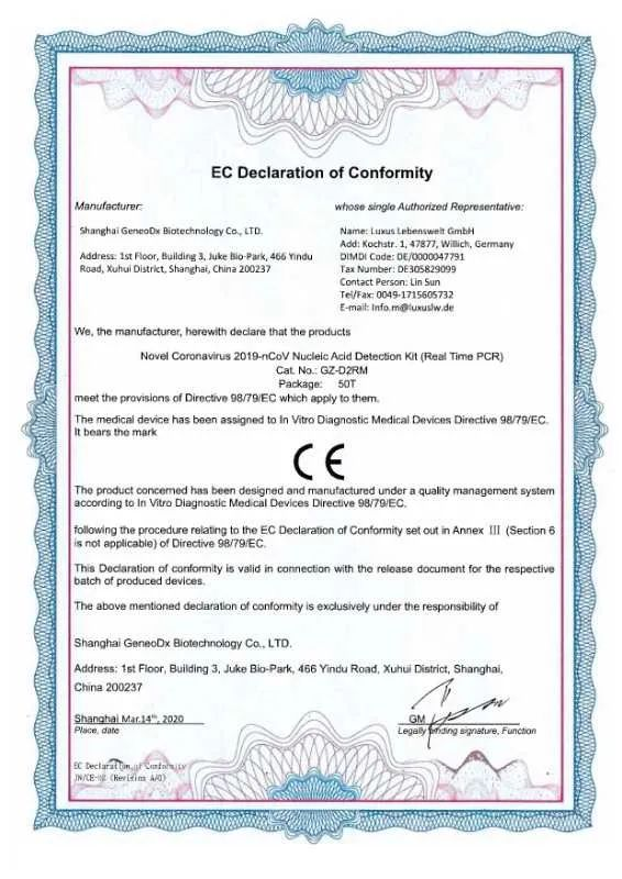 3月14日,安博一站式服务官网中国生物上海捷诺完成了自主研发的新型冠状病毒2019-nCoV核酸检测试剂盒(荧光PCR法)的欧盟CE认证。欧盟CE认证表明该产品符合欧盟医疗器械相关指令的符合性要求,具备欧盟市场的准入条件。