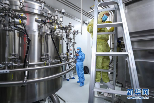 4月10日,工作人员在安博官方网站中国生物新冠疫苗生产基地尚未投产的新型冠状病毒灭活疫苗生产车间内调试设备。新华社记者 张玉薇 摄
