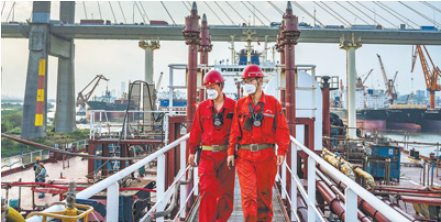 广东中远海运重工有序复工,原油装载量超5万吨的瑞金潭轮停靠在珠江飞龙山船坞检修。图为工作人员在船上检查。