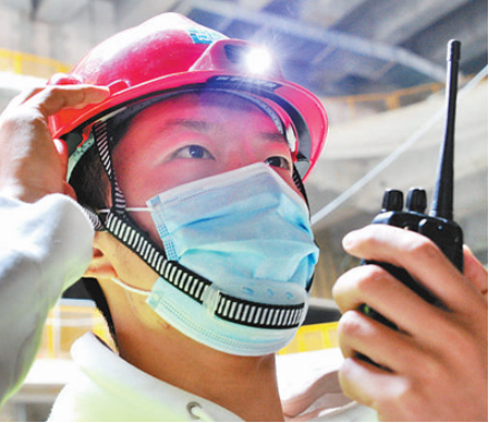 4月7日,上海虹口区一项目工地上,中建三局安监人员通过“智能巡查安全帽”录像照明功能巡查工地安全。