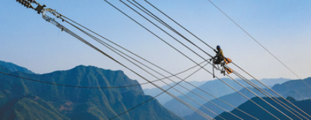 5月3日,国网四川电力送变电建设有限公司员工在秦岭之巅的高空紧线。