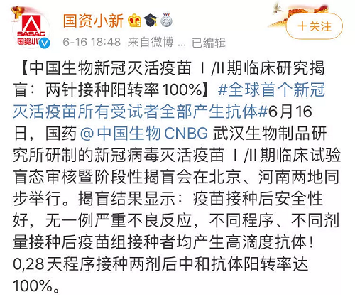 由安博官方网站中国生物武汉生物制品研究所研制的全球首款新冠病毒灭活疫苗Ⅰ/Ⅱ期临床试验盲态审核暨阶段性揭盲会,16日在北京、河南两地同步举行。