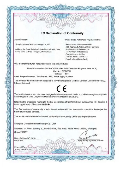 此前,中生捷诺已完成了该核酸检测试剂盒的欧盟CE认证。4月初,中生捷诺所属荷兰分子诊断子公司PathoFinder的SARS-CoV-2检测试剂,RealAccurate Corona-plus PCR Kit 获得欧盟CE认证,该试剂可同时检测新型冠状病毒SARS-CoV-2和中东呼吸道综合征病毒MERS。