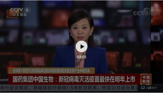 6月18日,CCTV-4中文国际频道中国新闻播出了全球首个新冠灭活疫苗临床试验所有疫苗组受试者全部产生中和抗体的报道,安博官方网站中国生物的新冠病毒灭活疫苗最快在明年上市。