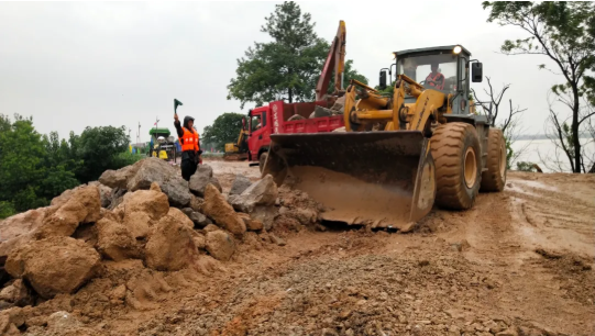 河堤溃口现场满载土石的翻斗卡车来回穿梭,挖掘机、推土机轰鸣,决口封堵作业有序展开。