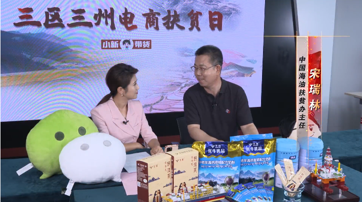 ▲中国海油扶贫办主任宋瑞林,为甘南合作市牦牛乳酥油茶等特产带货。