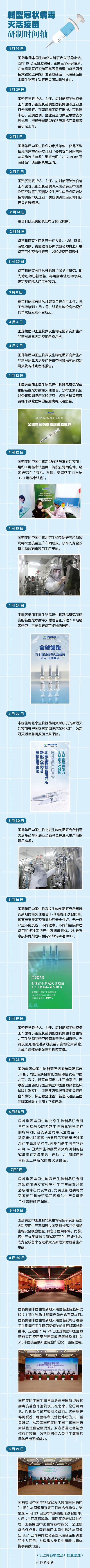 4月12日,中国生物武汉生物制品研究所研发的新冠灭活疫苗全球首家进入Ⅰ/Ⅱ期临床试验。4月27日,中国生物北京生物制品研究所研发的新冠灭活疫苗也进入Ⅰ/Ⅱ期临床试验。两个疫苗的Ⅰ/Ⅱ期临床研究共入组2240人,6月16日和28日分别揭盲,结果显示疫苗接种后安全性好,无一例明显不良反应;不同年龄、不同程序、不同剂量疫苗接种后,均产生高滴度免疫应答。两款新冠灭活疫苗在安全性、有效性等产品性能全面领先全球。