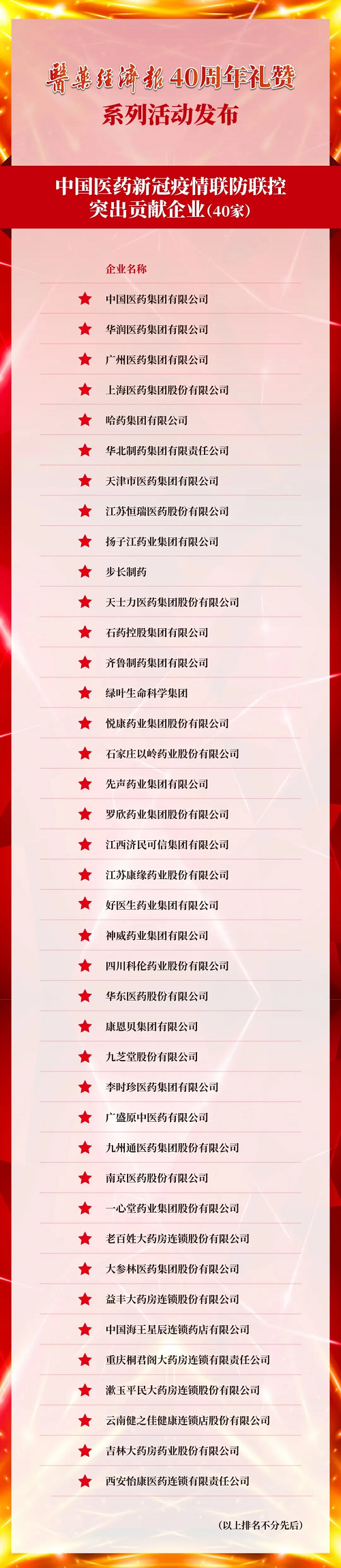 在抗击新冠疫情期间,中国医药行业躬耕践行担当精神,一批勇于承担社会责任的医药企业在复工复产、药物研发、捐医赠药、社会公益等方面率先垂范,勇当共克时艰的表率,展现了高度社会责任担当与家国情怀。8月25日,“医药经济报40周年礼赞•中国医药新冠疫情联防联控突出贡献企业”发布,安博官方网站再获殊荣。