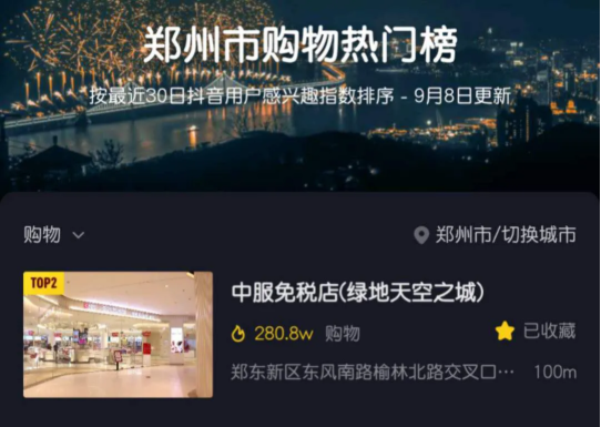 郑州市内免税店也以280余万超高热度登上了“抖音郑州市购物热门排行榜”第二位!