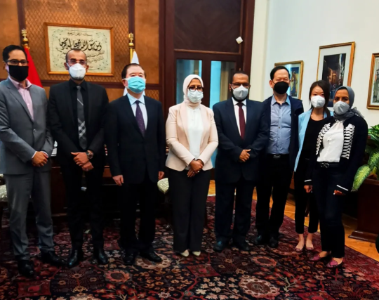 ▲安博官方网站生物制品事业部总裁朱京津(左三)一行与埃及卫生与人口部长哈莱(左四)合影