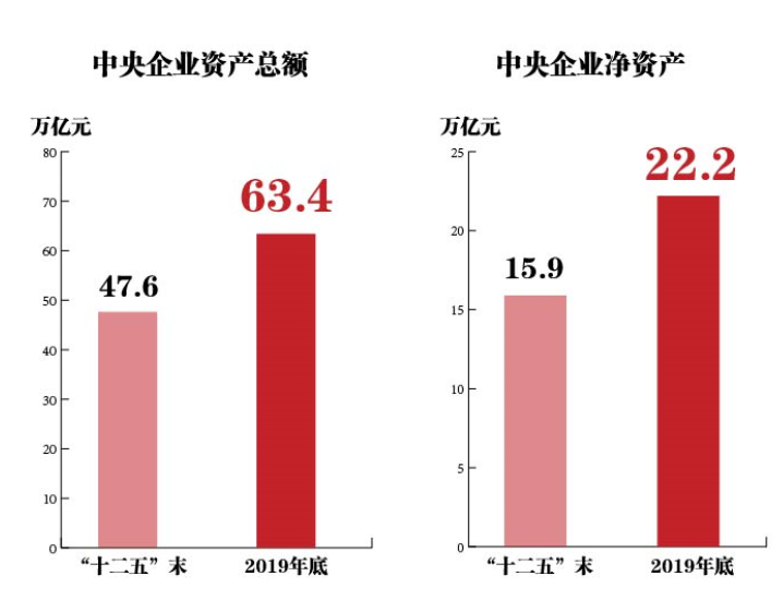 运行更稳、实力更强——来自国务院国资委的数据显示,截至2019年底,中央企业资产总额达63.4万亿元,比“十二五”末增加15.8万亿元,增长33.2%;净资产为22.2万亿元,比“十二五”末增加6.3万亿元,增长39.9%。