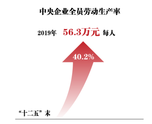 效益提升、布局优化——2019年中央企业实现营业收入31万亿元、利润总额1.86万亿元,分别比2015年增长35.6%和51.7%;2019年中央企业全员劳动生产率为每人56.3万元,比“十二五”末增长40.2%。国有资本进一步向重要行业和关键领域集中。