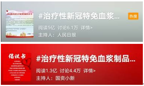 治疗性新冠特免血浆制品投入临床微博相关话题阅读量超过6.4 亿人次