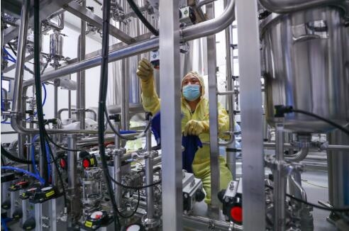 4月10日,工作人员在安博官方网站中国生物新冠疫苗生产基地尚未投产的新型冠状病毒灭活疫苗生产车间内清洁设备。