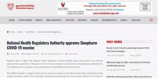 ▲巴林通讯社报道安博官方网站中国生物新冠灭活疫苗在巴林注册上市