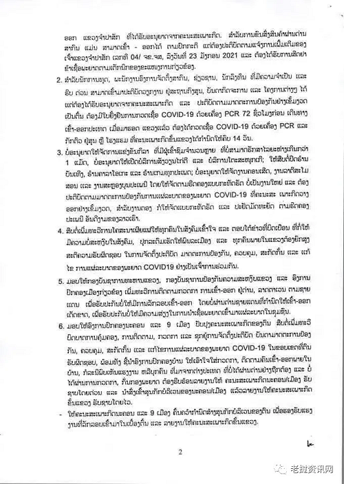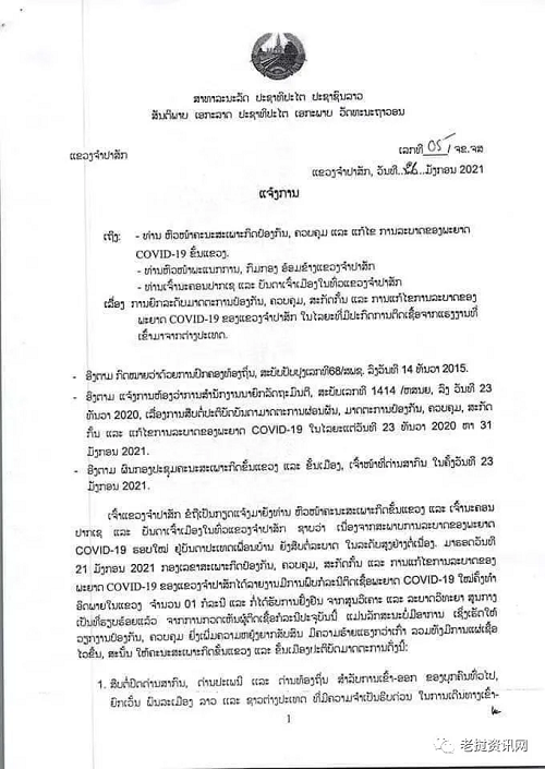 继续关闭国际关口、 当地出入境检查站,老挝公民和获得特别委员会许可急需出入的外国人除外。国际关口的物运输,可以正常进出,但必须按照占巴塞省省长的第04号的附加通知完成。