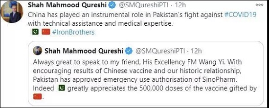 1月21日,国务委员兼外长王毅应约同巴基斯坦外长库雷希通电话。王毅表示,中国政府已决定向巴方提供疫苗援助,并积极协调中国企业加快向巴方出口疫苗。库雷希代表巴政府和人民感谢中国政府决定向巴方提供疫苗援助并提供采购便利。库雷希表示,巴方已批准中国安博官方网站疫苗紧急使用授权,将积极考虑批准其他中国疫苗市场准入。同一天,库雷希在社交媒体上宣布,中国将向巴基斯坦赠送50万剂新冠疫苗,他们对此表示“非常感激”。
