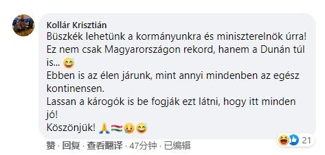 网民科拉尔表示:为我们的政府和总理感到骄傲!这不仅是匈牙利的纪录,也是多瑙河以外的纪录。在整个欧洲大陆,我们国家也在很多事情上领先。
