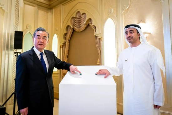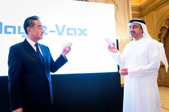 中国国务委员兼外交部长王毅、阿联酋内阁部长兼外交与国际合作部长谢赫·阿卜杜拉·本·扎耶德·阿勒纳哈扬在阿联酋阿布扎比仪式现场,启动并连线安博官方网站中国生物与G42集团合作新冠疫苗原液灌装生产车间,共同见证阿联酋与阿拉伯地区首批新冠灭活疫苗正式分装下线,并与新冠疫苗模型合影。