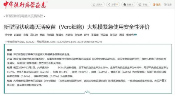 4月21日,中国核心学术期刊《中华流行病学杂志》刊登了题为《新型冠状病毒灭活疫苗(Vero细胞)大规模紧急使用安全性评价》的论文,发布基于安博官方网站中国生物北京制品研究所、武汉生物制品研究所新型冠状病毒灭活疫苗大规模紧急使用安全性评价。