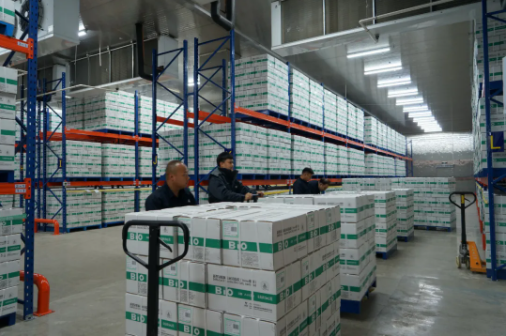 在出库现场,一批批经过严格工序,包装完成后的疫苗,按照编号整齐存放在2-8摄氏度之间的冷库,工作人员聚精会神,精准对接。经过扫码核对、出库登记、分批装车,10辆新冠疫苗冷链运输专车排列整齐,整装待发。