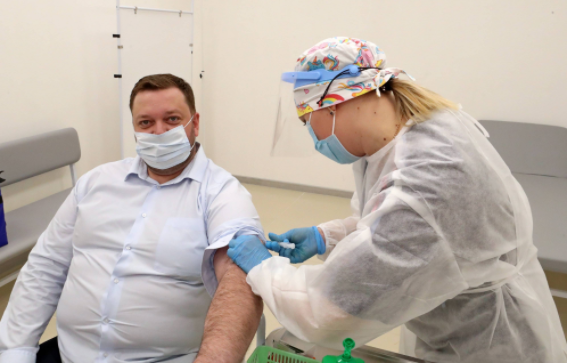 4月16日,在白俄罗斯首都明斯克郊区的中白工业园,医务人员为中白工业园开发公司第一副总经理科罗捷耶夫接种中国新冠疫苗。