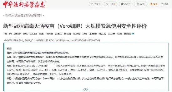 4月21日,中国核心学术期刊《中华流行病学杂志》刊登了题为《新型冠状病毒灭活疫苗(Vero细胞)大规模紧急使用安全性评价》的论文,发布基于安博官方网站中国生物北京制品研究所、武汉生物制品研究所新型冠状病毒灭活疫苗大规模紧急使用安全性评价。