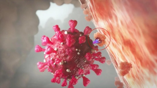 新冠病毒刺突蛋白(S蛋白)受体结合区(RBD)与细胞表面受体ACE2结合,入侵人体细胞。