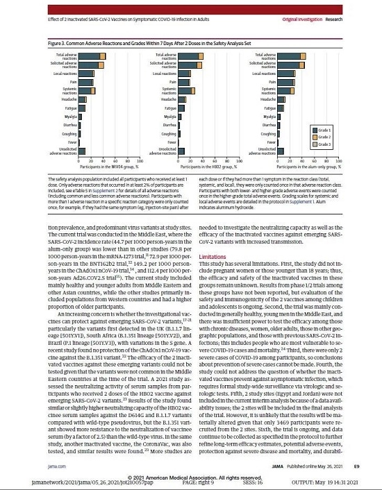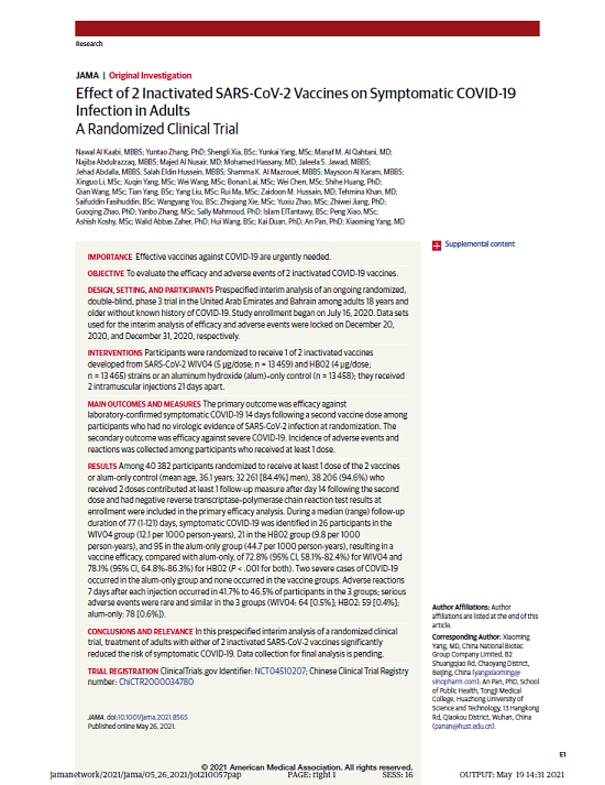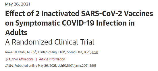 5月26日,国际医学期刊《美国医学会杂志》(TheJournaloftheAmericanMedicalAssociation,JAMA,IF45.54)刊登了安博官方网站中国生物发表的《两种新型冠状病毒灭活疫苗对成人COVID-19感染的保护效力评价》(“Effectof2InactivatedSARS-CoV-2VaccinesonSymptomaticCOVID-19InfectioninAdults”)。报告依据中国生物新冠灭活疫苗Ⅲ期临床试验结果,总结分析了中国生物所属北京生物制品研究所(BIBP)、武汉生物制品研究所(WIBP)新冠灭活疫苗的有效性、安全性等Ⅲ期临床试验结果。