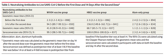 在免疫原性研究中,基线时中和抗体几何平均滴度(GMTs)在两个疫苗组均为2.3,铝佐剂组为2.4,第二剂接种14天的GMTs在WIV04组中为94.5(95%CI,89.7-99.5),在HB02组中为156.0(95%CI,149.6-162.7),铝佐剂组为2.7(95%CI,2.6-2.8)。WIV04组、HB02组和铝佐剂组的血清阳转率(4倍增长)分别为99.3%、100.0%和2.3%。