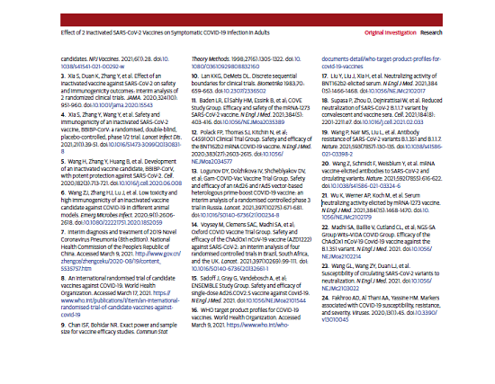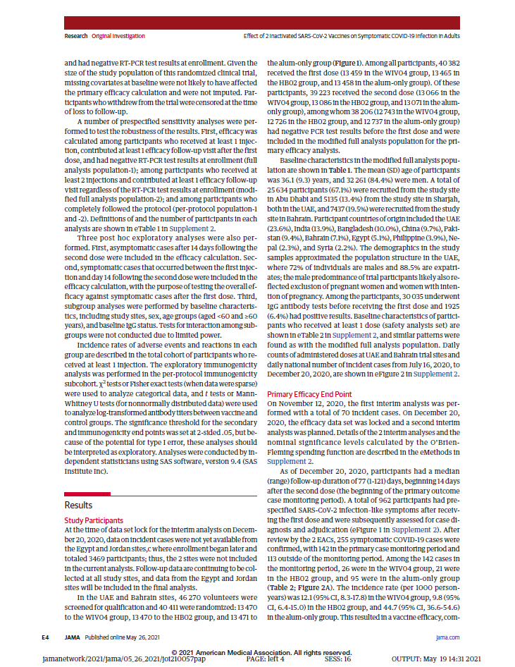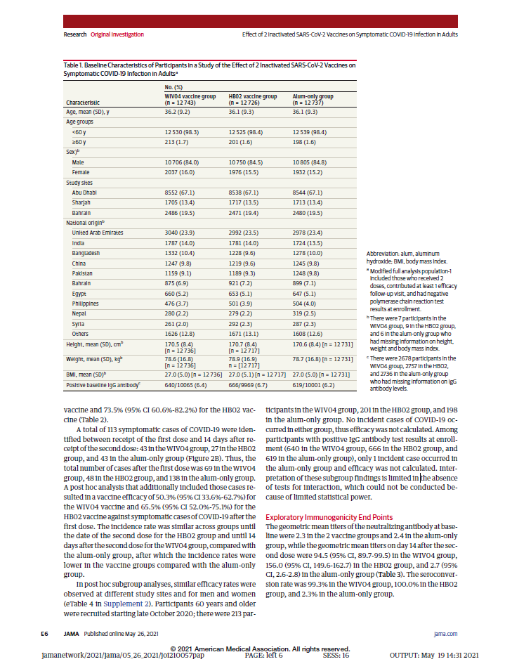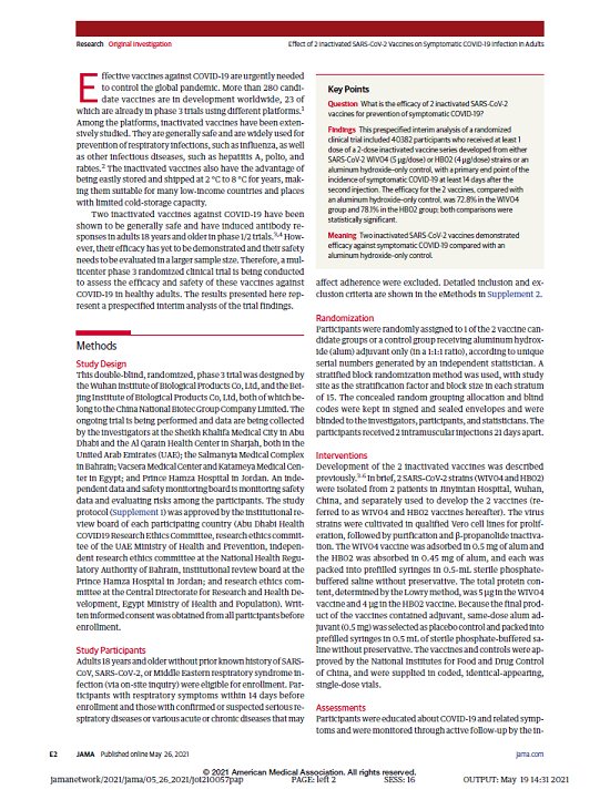 本项研究结果针对中国生物两款新冠灭活疫苗随机、双盲、安慰剂对照的Ⅲ期临床试验开展的中期分析。自2020年7月16日起,40411名受试者入组并随机分为三组,分别为铝佐剂组、新冠疫苗WIV04组和新冠疫苗HB02组。受试者在第0天和第21天接受两次肌肉注射。自第二剂接种后14天,累计确诊142例有效病例(铝佐剂组95例,WIV04组26例,HB02组21例),两种疫苗组有效率分别为72.8%和78.1%(均P<.001)。铝佐剂组出现2例重症病例,两个疫苗组均未出现重症病例。接种后7天总不良反应发生率在铝佐剂组为46.5%,WIV04组为44.2%,HB02组为41.7%。严重不良事件在三组无显著性差异。在两个疫苗组中血清阳转率均高于99.0%(与基线相比中和抗体滴度至少增加4倍),而在铝佐剂组中为2.3%。目前,该研究仍在进行中,长期保护性和安全性仍在评估中。