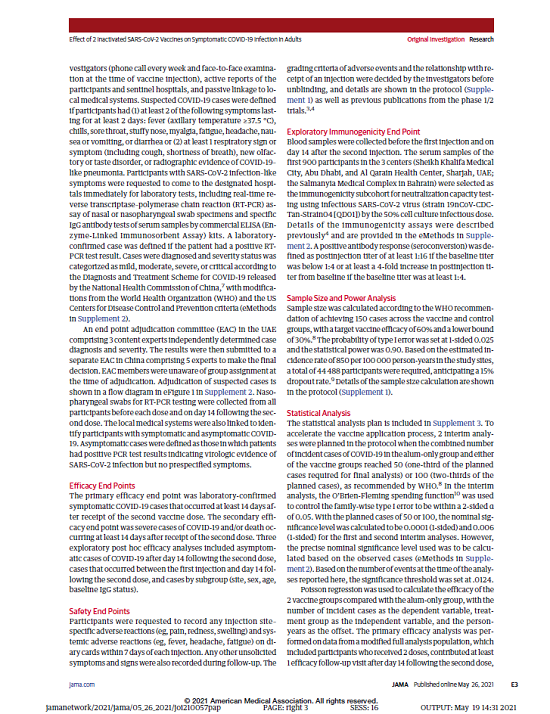 本研究是采用随机、双盲、安慰剂对照的Ⅲ期临床试验,由中国生物所属北京生物制品研究所(BIBP)和武汉生物制品研究所(WIBP)作为申办方,由参与的研究者实施并进行相关数据的收集,他们来自阿布扎比谢赫·哈利法医疗城、沙迦AlQarain保健中心、巴林Salmanyia医院、埃及Vacsera医疗中心和Katameya医疗中心、约旦哈姆扎王子医院。另外设立了独立的数据和安全监测委员会(DSMB)用于监测安全数据并评估受试者风险。该临床方案由每个参与国的机构审查委员会批准(阿布扎比卫生COVID-19研究伦理委员会、阿联酋卫生和预防部研究伦理委员会、巴林国家卫生管理局独立研究伦理委员会、约旦哈姆扎王子医院机构审查委员会以及埃及卫生和人口部研究和卫生发展局研究伦理委员会)。所有受试者在入组前均签署知情同意书。