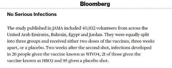 发表在《美国医学会杂志》上的这项研究覆盖来自阿联酋、巴林、埃及和约旦的40832名志愿者。他们被平分为三组,注射两剂疫苗或者安慰剂。第二剂疫苗注射两周后,注射了疫苗的志愿者中没有一名出现严重症状,而注射安慰剂的志愿者有两名出现严重症状。
