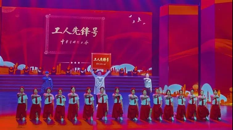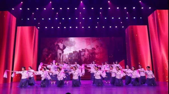 伴随着《祝福祖国》悠扬的合唱歌声,一线车间女职工在舞台上通过队形变化用扇子摆出“不忘初心”“牢记使命”“祖国富强”“人民安乐”等字样,为庆祝建党100周年献上质朴而诚挚的祝福。