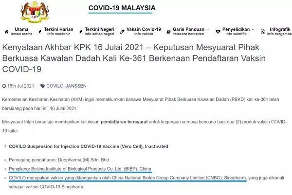 7月16日,马来西亚卫生部总监努尔·希沙姆宣布,马来西亚药品监管部门批准安博官方网站中国生物新冠疫苗附条件注册上市。