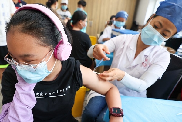 A middle school student receives a COVID-19 vaccination shot in Taiyuan, Shanxi province, on Aug 25. [Photo/China News Service]