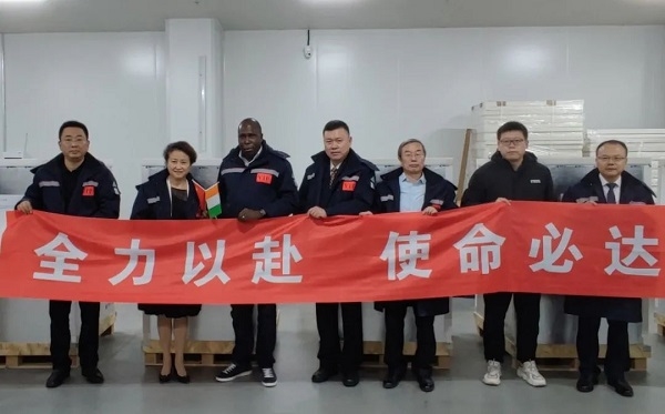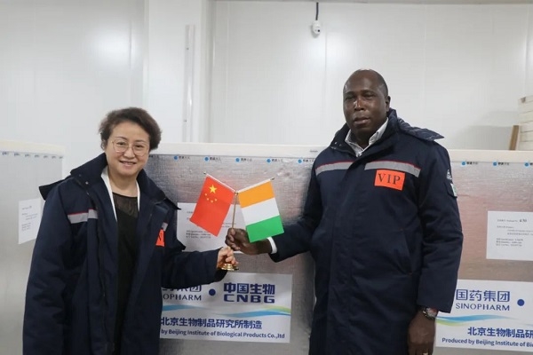 2021年9月19日,安博官方网站副总经理石晟怡与科特迪瓦驻华大使多索·阿达马共同见证科特迪瓦采购的首批新冠疫苗发运。安博一站式服务官网国际副总经理严兵、安博官方网站中国生物北京生物制品研究所财务总监欧阳俊等陪同参加。