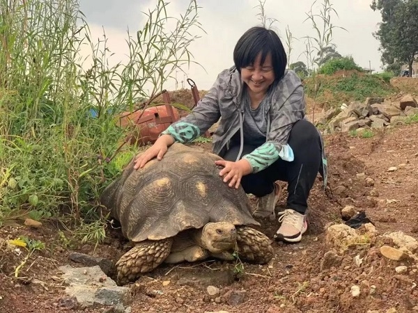 图为城建院设计人员在施工现场悉心照看苏卡达象龟