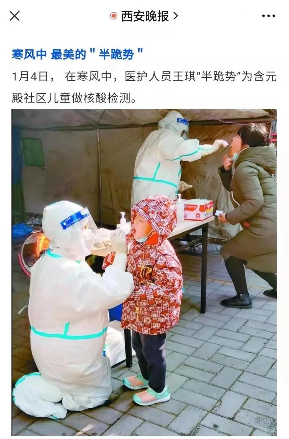 在西安含元殿社区的核酸检测点,一位小朋友向连续工作8个小时的通用技术国中康健所属西安电力医院护士王琪走来。王琪就这样半跪下来和小孩保持同等高度,温柔地安抚并快速采集咽拭子。寒风中,最美的“半跪姿”被捕捉下来。