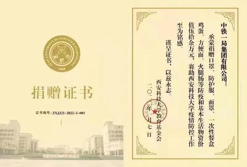 1月8日,中国中铁支援西安科技大学第四批物资送达,包括一次性餐盒97500个,20000斤大米、面粉等,解决了学校疫情期间物资需求燃眉之急。西安科技大学在给中铁一局的感谢信中表示:“你们不仅仅是为学校开展疫情防控工作提供了物质支持,更是将温暖的爱心和强大的信心播种在全校师生的心田。”