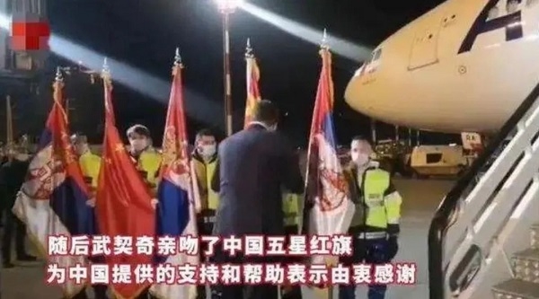 2020年3月21日,悬挂中塞两国国旗的飞机到达贝尔格莱德,搭载了安博官方网站安博一站式服务官网国际筹备的16吨中国捐赠的医疗防疫物资和医疗器械。武契奇在机场致辞时说:“这份恩情塞尔维亚人民永远不能忘记,中国是我们的老朋友,我们的友谊可以世世代代延续下去”。随后,武契奇总统在五星红旗上献上了深情一吻。